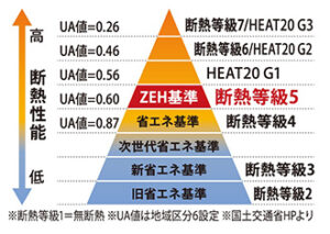※UA値:外皮平均熱貫流率、室内と外気の熱の出入りのしやすさの指標で値が小さいほど断熱性能が高くなります。